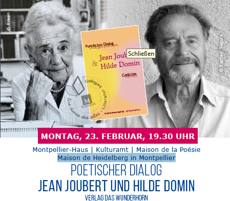 Une deuxième session a eu lieu à Heidelberg en mars 2025, afin que des poèmes de Hilde Domin (1909 – 2006) puissent être traduits pour la première fois en français. Aujourd’hui, à l’occasion du 20e anniversaire de la mort de Hilde Domin et du 65e anniversaire du jumelage entre Heidelberg et Montpellier, ces poèmes et leur traduction sont publiés dans une édition bilingue aux éditions das Wunderhorn, en même temps que ceux de Jean Joubert.